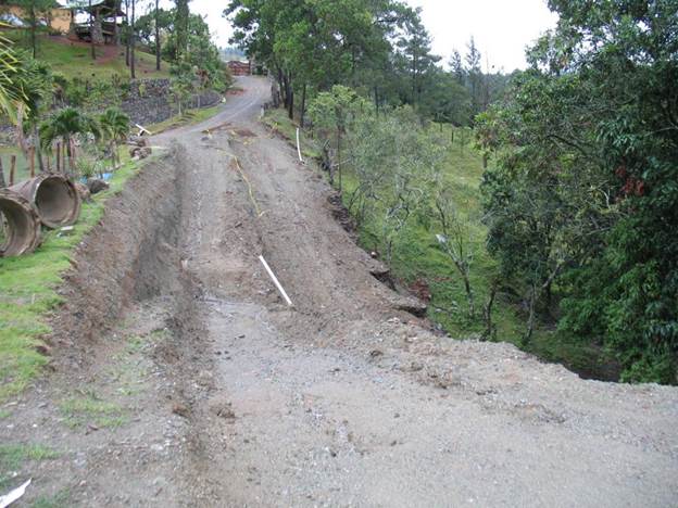 Here is another view of the washed out road. You can see the poles are up for the fence but we have