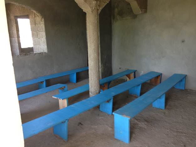 Here is the inside of the gym with the athletic field in the background. The bleachers were built by a team from our church,
