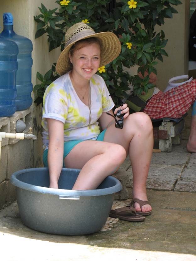 The table behind me is where we set up the dishwashing station after each meal. They are trying to raise